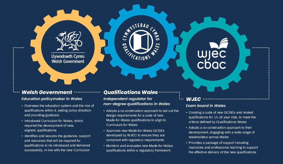 Welsh Government, Qualifications Wales (QW) and WJEC, all have distinct roles and responsibilities within the development of qualifications in Wales.